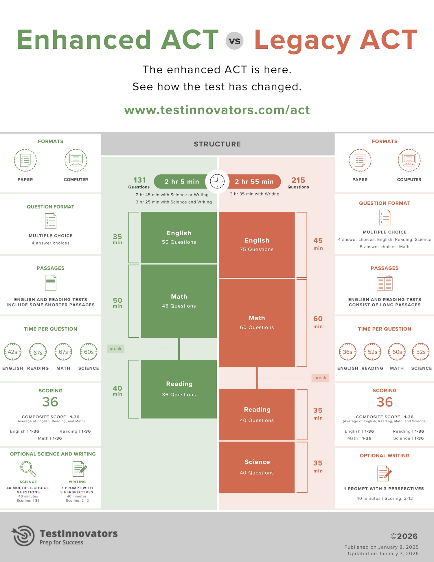 The ACT has changed. The new version of the test is shorter and offers students more choice and flexibility. The infographic below compares the new version (“Enhanced ACT”) to the old version (“Legacy ACT”), so you can see what’s changing and what’s staying the same.